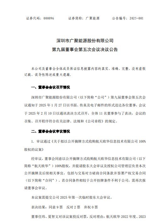 然而,两名董事任玮、夏智文对收购提出明确反对。他们认为,航天欧华2022年至2024年净利润分别为-2277.95万元、-74.35万元、-5194.13万元,亏损规模持续扩大,短期内扭亏难度极高。若纳入合并报表,可能拖累广聚能源整体业绩。二人建议公司应聚焦战略性新兴产业或新质生产力领域标的,而非接手历史包袱沉重的资产。